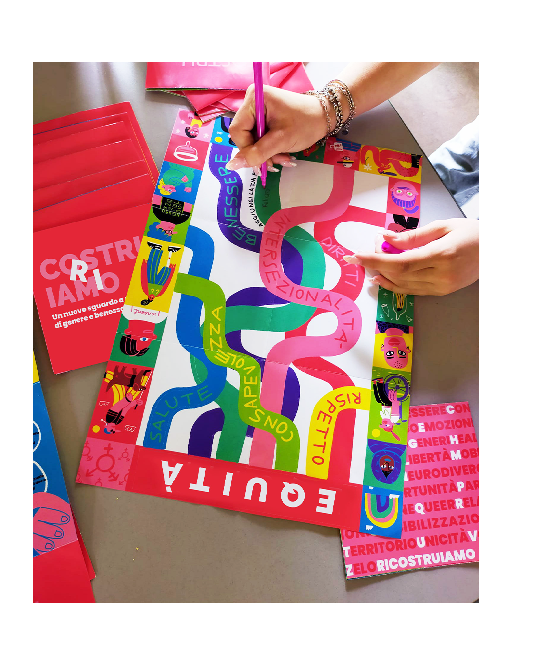 “Ricostruiamo” is a project developed in collaboration with Edi onlus, Movimento giovani for Save the children Italia, and students from Amedeo di Savoia Duca D’Aosta Institute (Padua). We designed an interactive leaflet that turns into a poster, raising youth awareness on gender equity and the impact of context and privilege on individual opportunities. A visual tool promoting a more fair and inclusive society.