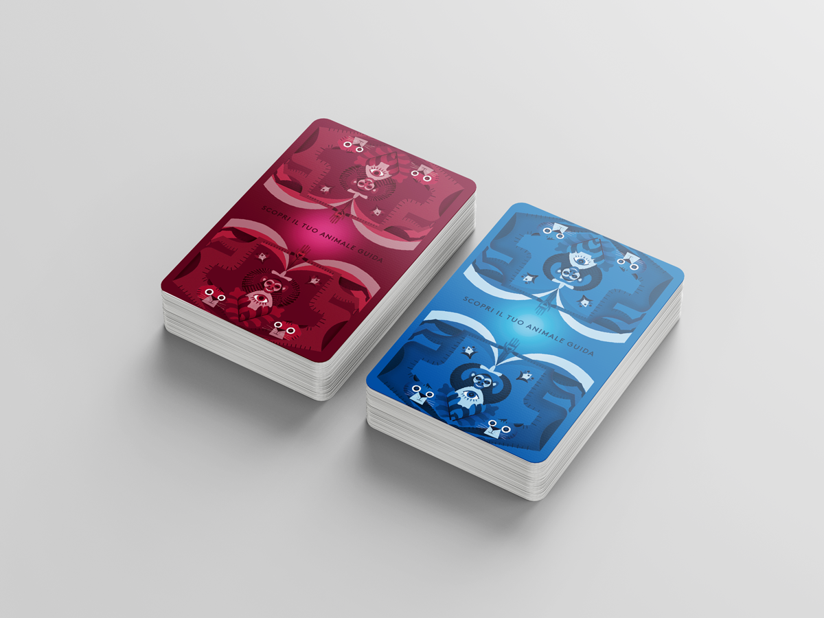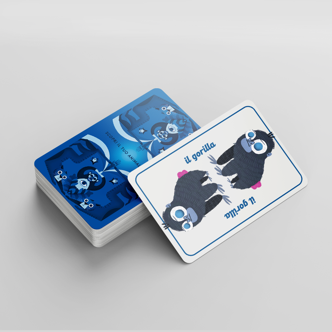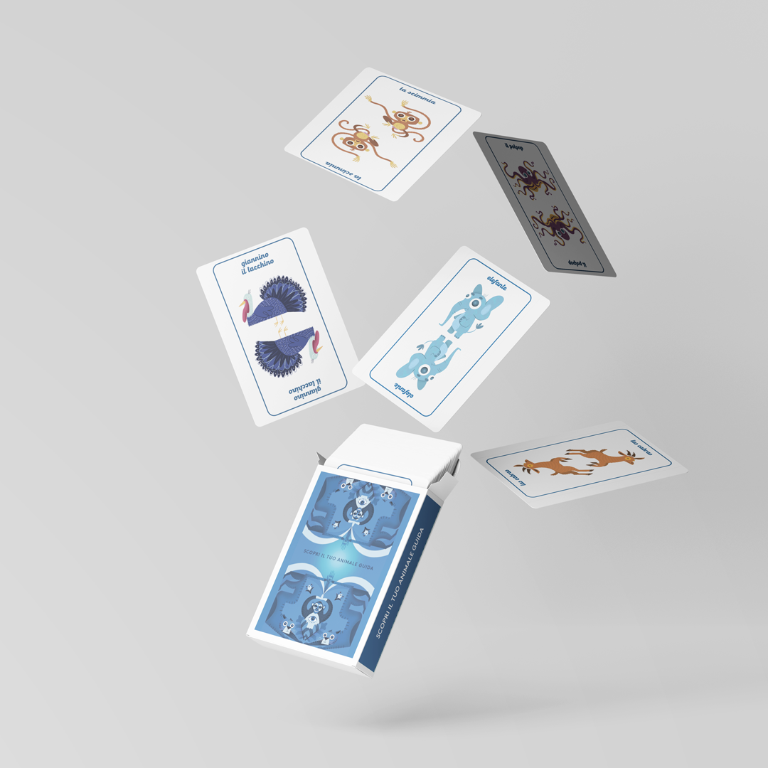 Inside the cardboard box, there are 2 decks of cards: a red one with descriptions and a blue one with animals. People had to pick from the blue deck the animal and after it go and read the description in the red deck to figure out what their “Guide Anima” was.