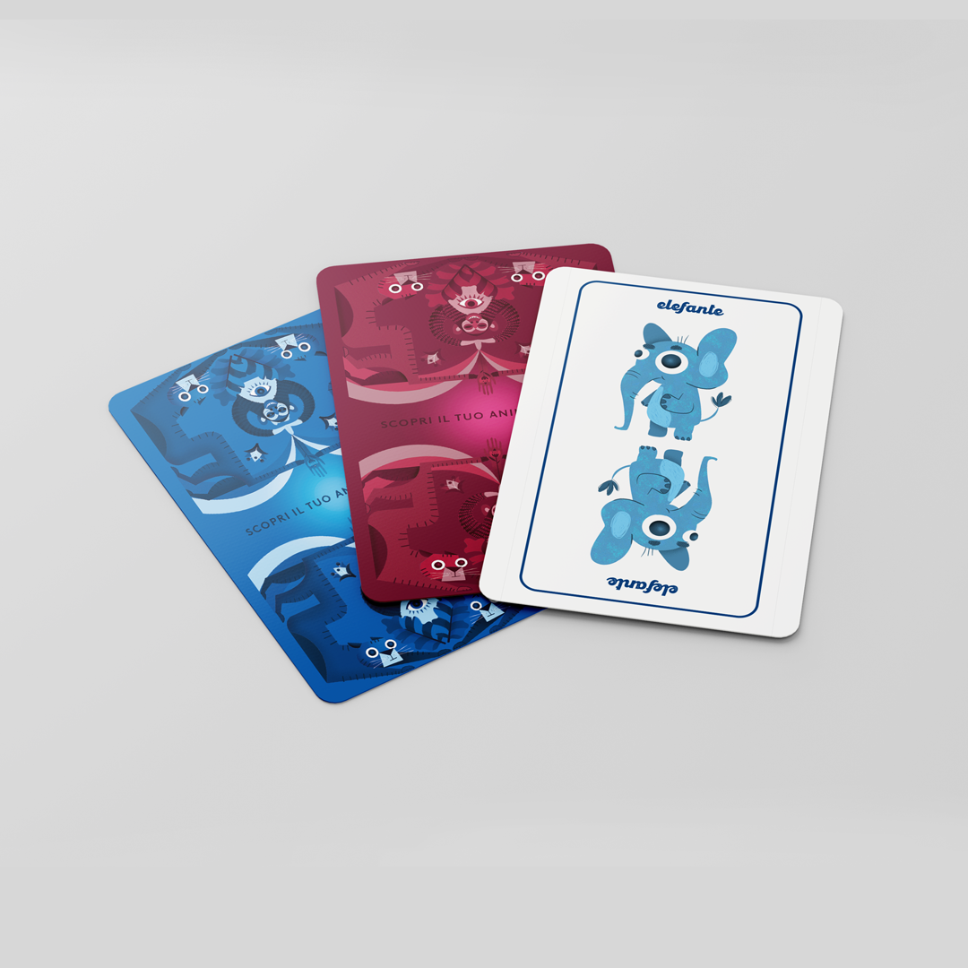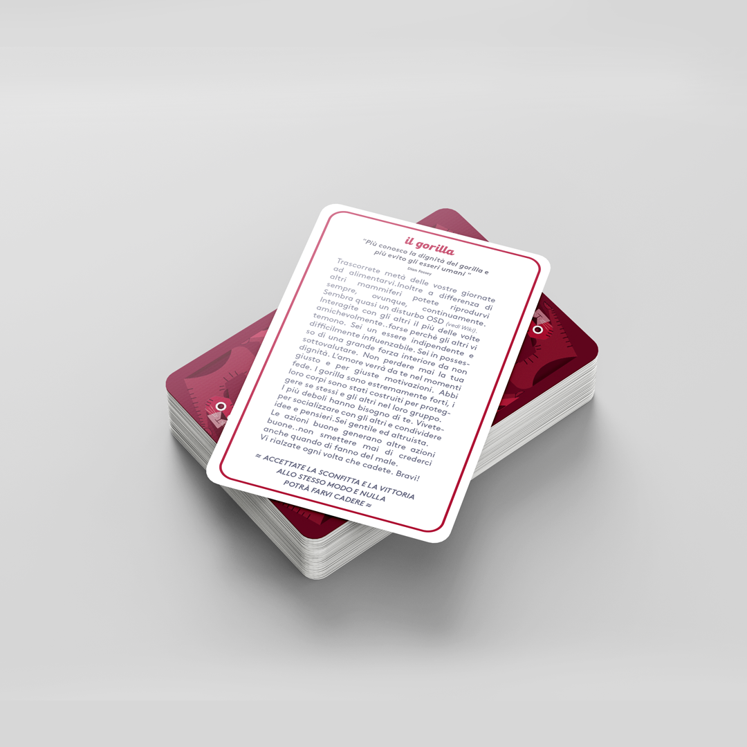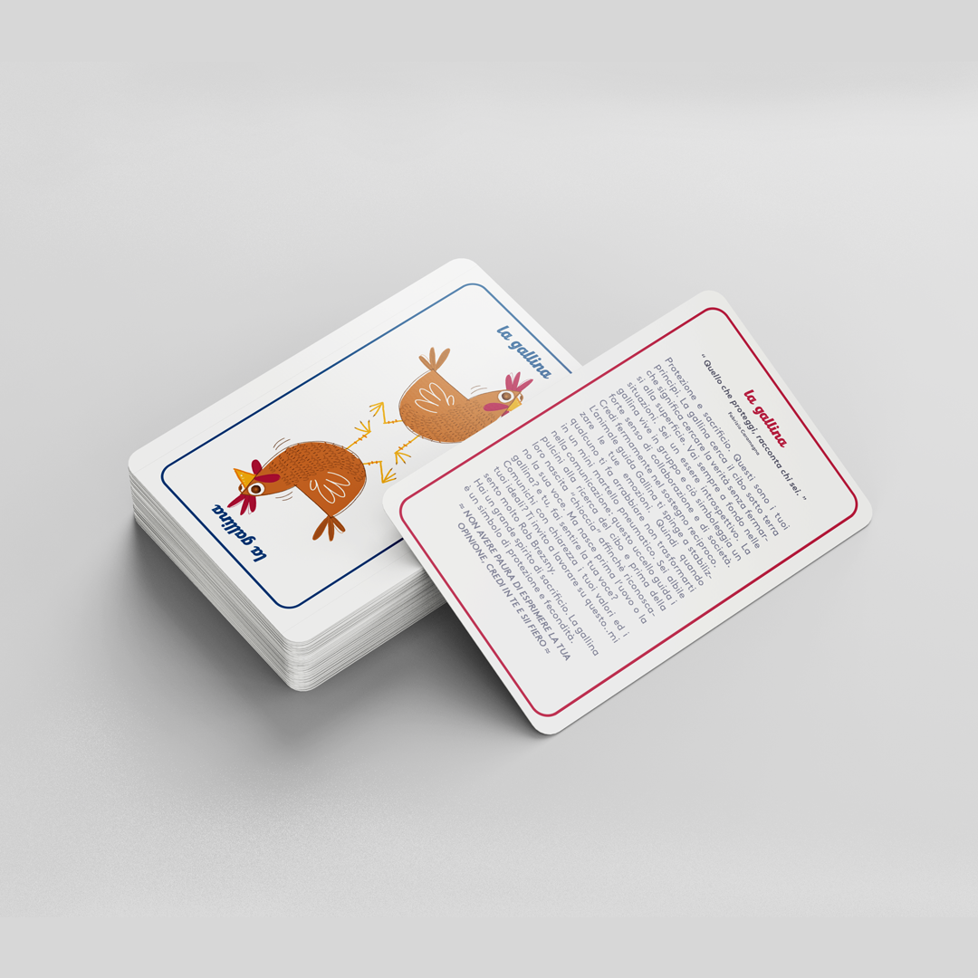 Inside the cardboard box, there are 2 decks of cards: a red one with descriptions and a blue one with animals. People had to pick from the blue deck the animal and after it go and read the description in the red deck to figure out what their “Guide Anima” was.