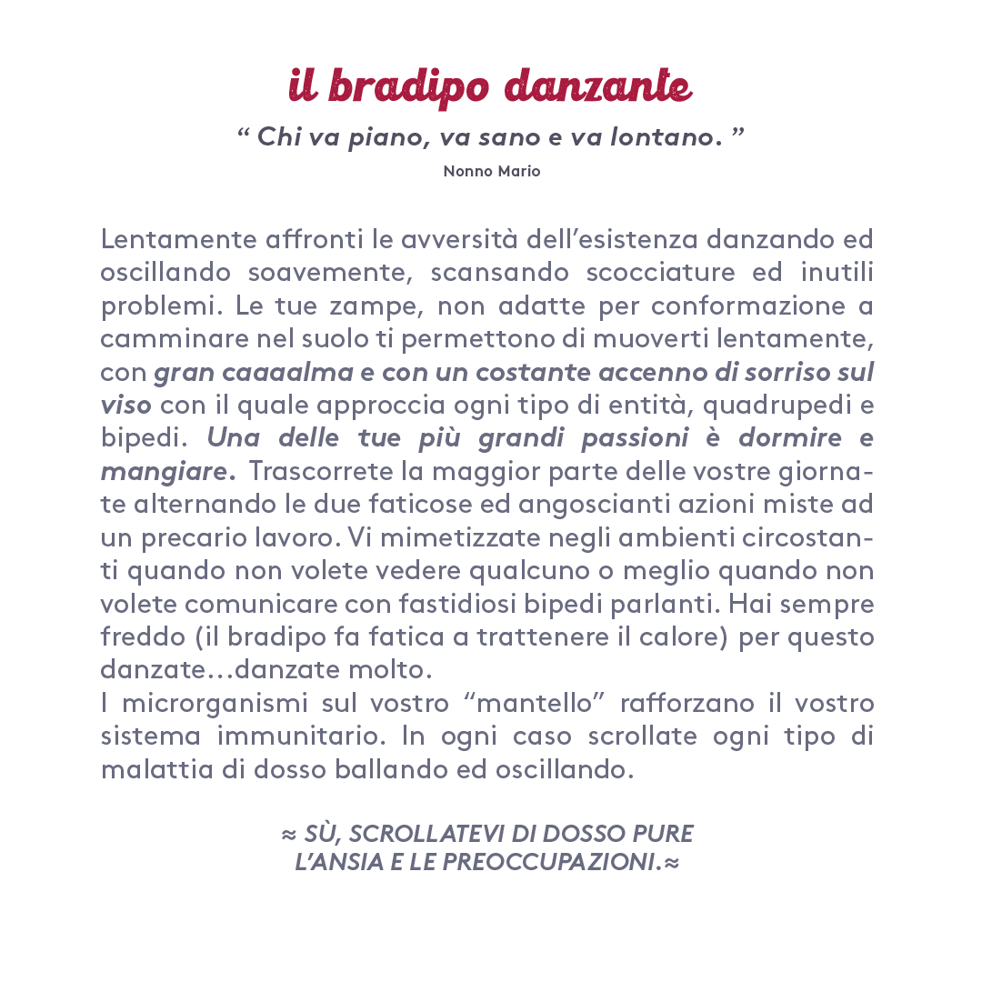 “Scopri il tuo animale guida” – Discover Your Guide Animal – is a project I did for “Crack” festival in Rome in June 2022. I drew 72 animals and their respective descriptions (character, behavior, habits).
